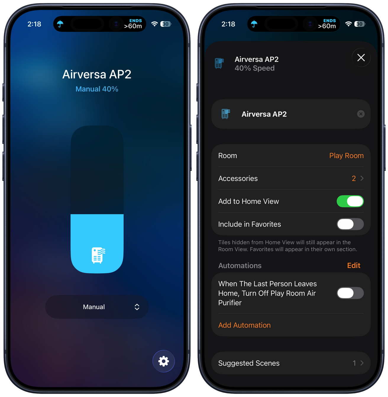 Within the Home app, you can change modes (auto, manual, or off), view the air quality, and adjust the fan speed. Unfortunately, you can't view the filter life in the Home app.